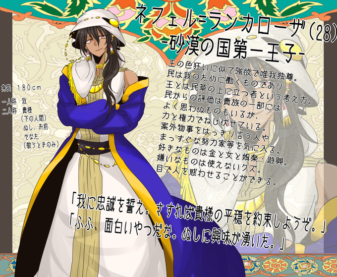 垢変更のためあげ直します! キャラシ失礼します~!砂漠の国第一王子のネフェルです('ω')! えらそーなやつですが…よろしくお願いしますーー! #王国恋愛物語 #王国恋愛物語名簿 #王恋_砂漠の国