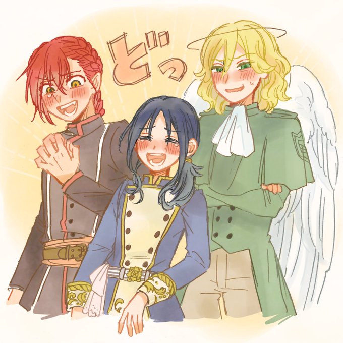 魔法学園の寮生3人組 通称少年トリオです 黒髪は身分を伏せて亡命中の某国の王子ユーイ、赤髪は獣人に近い血を持つ種族出身で肉体派のヴァイヒェル、金髪は記憶喪失の飛べない高飛車天使ソルシオ 順に14,14,15才だよ
