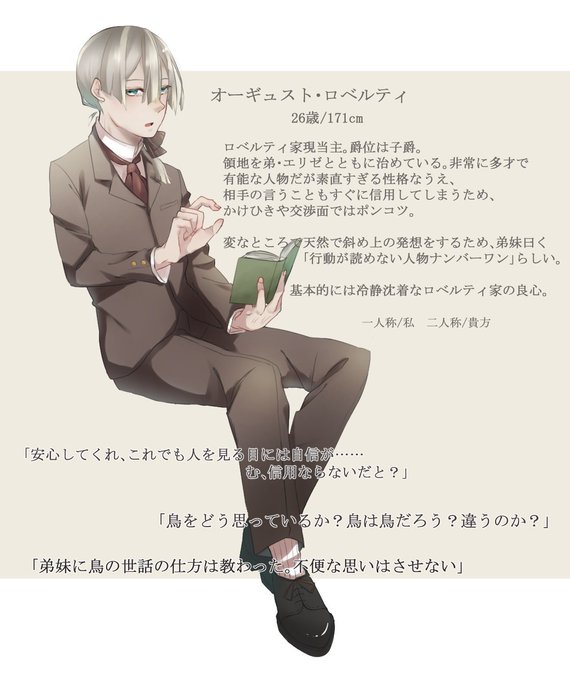 @tori_torikagoTL は、八人目失礼いたします......!恐らく交流が非常にまったりなので鳥さんに関してはそれでも良いと言うご縁がありましたら...... 弟妹よりはまともな性格してるので仲良くしていただけると幸いです~! #鳥と鳥籠 #鳥と鳥籠_キャラシ
