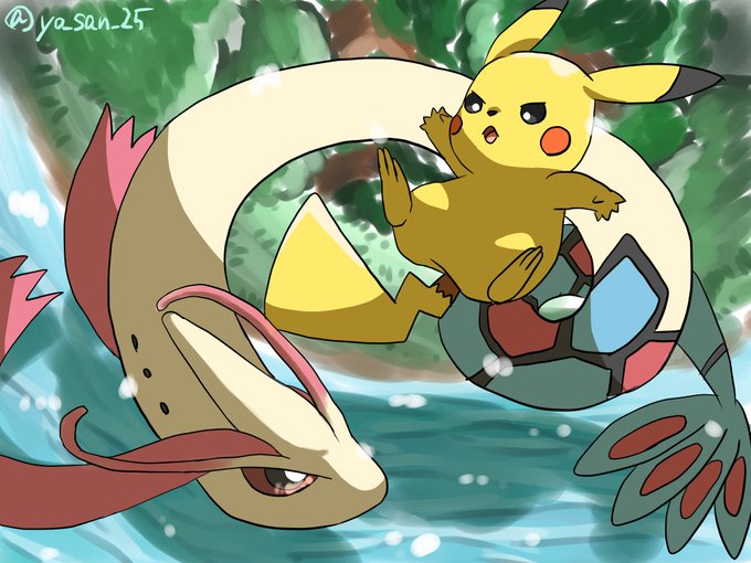 ピカとミロカロス! なんやかんや、まともにピカを描いたの実は今日が初めてだったんだけど、あまりの描きやすさに「これが主人公ってやつか………!」ってなりました。 #ポケモン版深夜の真剣お絵描き60分一本勝負