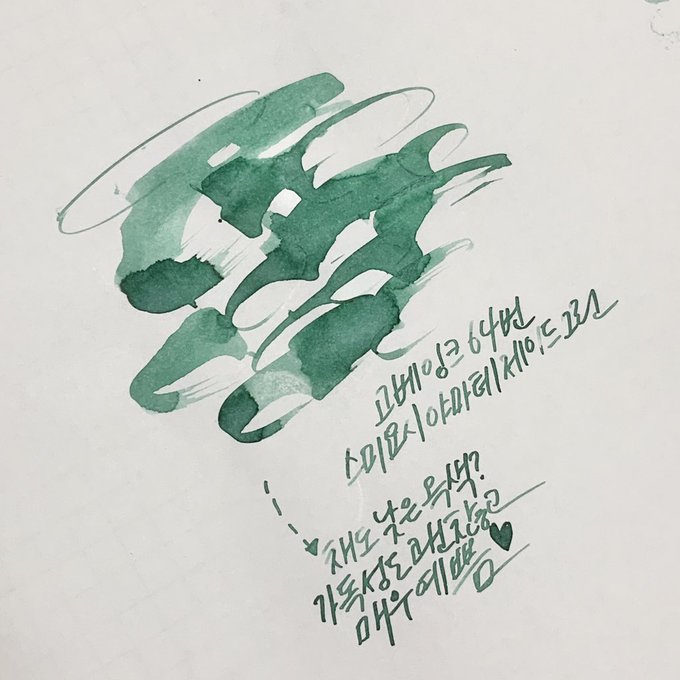 호불호 갈릴수있다고 생각했는데 생각보다 제 시필보고 구매하시는 분들이 많아서 타래에도 추가해봅니다! 이름 그대로 정직한 잉크! 숲색같은 초록색에 독특하게 검은색이 테처럼 올라오는 신비한 잉크✨ #케믿사