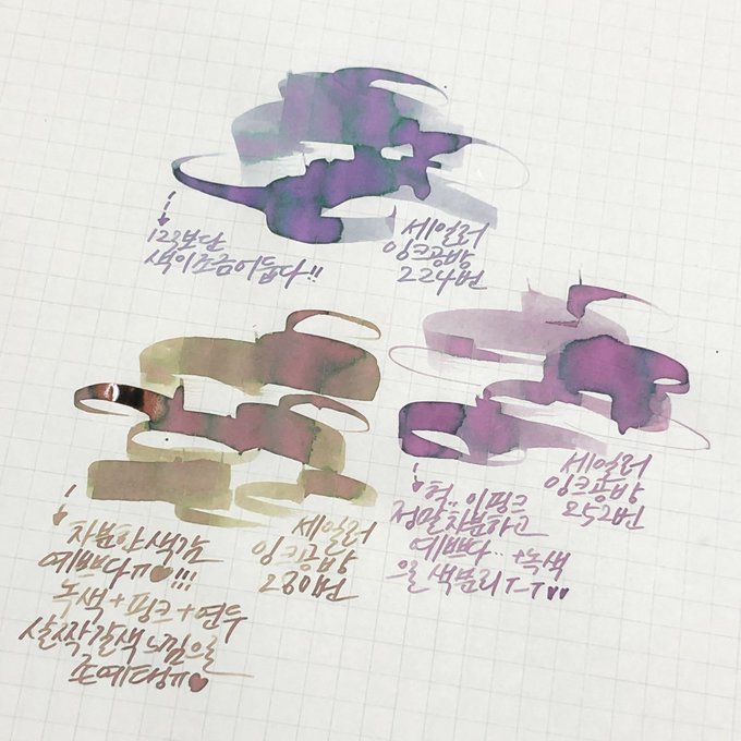 채도 낮은 보라와 자주색 중간! 자주빛이 더 많이 느껴지는 보라색. 개인적으로 잉크 많이 해서 어둡게 있는 부분이 고급스러운 느낌? 금테는 토모에리버에서 아주 쬐끔 뜬다✨