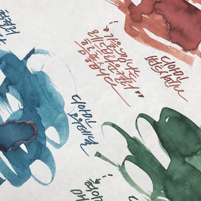 자수 18번은 정말 예쁜데.. 박해요. 완전! 긴자골드세피아 녹테 뜨는줄 알고 잉크 왕창 했다가 시필.. 망함😭 색은 매우 예쁩니다.. 빈티지한 갈색인데 살짝 녹색 느낌 은은-하게 나요🙌🏻