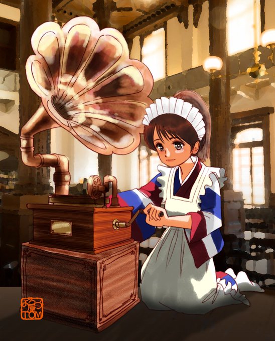 7月31日は『蓄音機の日』。 #1日一点とにかく描く #今日は何の日 #蓄音機 #レコード #ミルクホール #銘仙 #和服メイド https://t.co/3UCRrg8ail