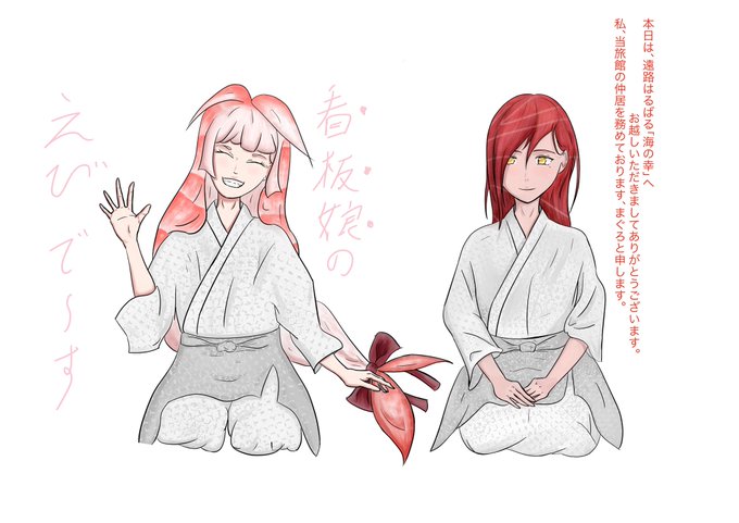 「海の幸(うみのさち)」という架空の旅館の仲居という設定で、まぐろとえびの寿司を擬人化してみました