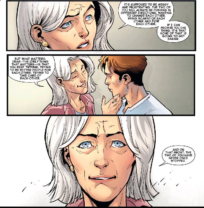 これでMJとの関係がダメになるのではと悩むピーターに、メイ叔母さん。「貴方がそうしたいと思っても、そんなこと起こらないわ」