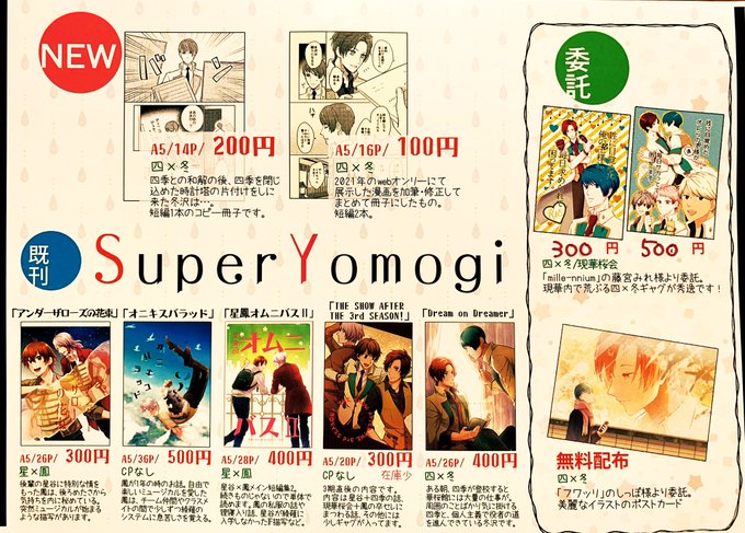 本日のお品書きです~! 新規2種と既刊のほか、委託として藤宮みれさん(@fjmyr18)のしきふゆ既刊2種としっぽさん(@shippo112)の美麗ポスカを置かせていただいております!こちらも併せてご覧ください😊