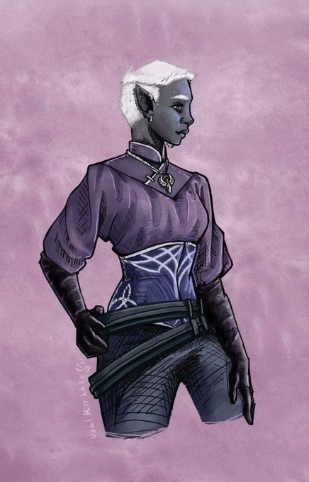 My brother talked me into a #CurseofStrahd camp, and since I felt Shade fitted the vibe well, I made an alternate of her called Iris (yes the irony is very intented), a Raven Queen Warlock with her trusty sentinel raven Sullivan.