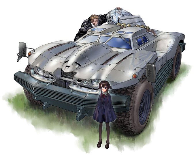 フレックスコミックスより大迫純一先生原作「神曲奏界ポリフォニカ ザ・ブラック」1巻収録イラスト。主人公マナガのサイズに合わせた特殊車両なので、ボンネット高がマチュアの身長を超える。