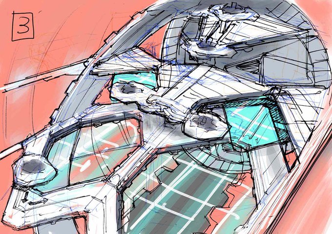 TVアニメ「BLUE DROP」より戦艦ノヴァール艦橋設定とラフ3枚。これは監督のラフがあって近いのは2番、採用されたのが3番となりました。全天スクリーンに爆撃機のような窓枠をつけたいと言うオーダーは、色々あって設定のようになりましたが、もっと窓枠に寄せて良かったかもしれない。
