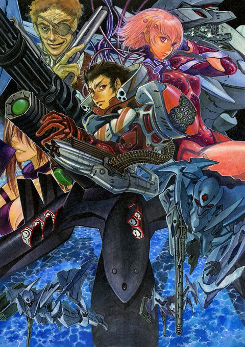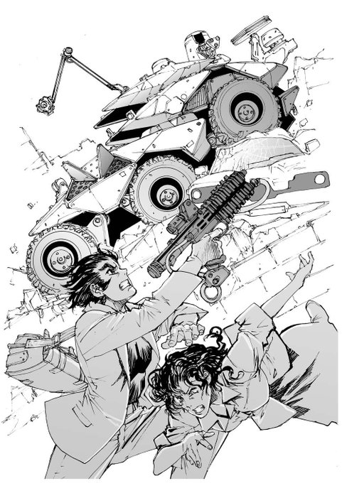 TRPG「メタルヘッド」カバーとそのラフ3枚。これは愛用していたキャンバスボードが生産中止になった後の仕事。代替品を探していてその候補の一枚を使ったものだったが、マスキングテープを外すたびに紙の表面が剥がれてその修正に追われた。