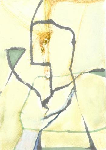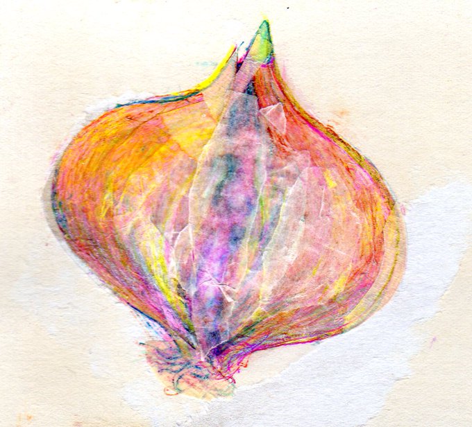 onion onion 「大きな真珠」の意のラテン語から。まあ、たまねぎですが、けっこう好きでオニオンリングが特に好物です。 表面をはがした厚紙、鉛筆+カラーインク+カラーペン、コラージュ