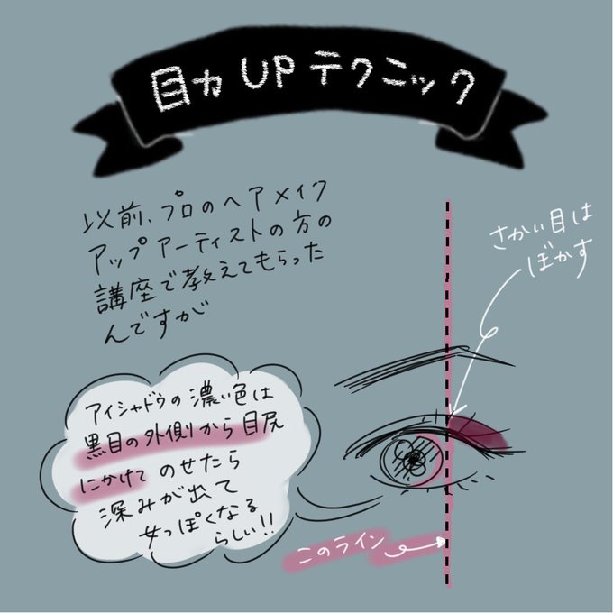 そしてプロに教えてもらった塗り方テクニックについても描いてみました!これやるとグラデーションがむっちゃ綺麗で、目元が美しいアートみたいになるの!すごい楽しい!。゚(゚´ω`゚)゚