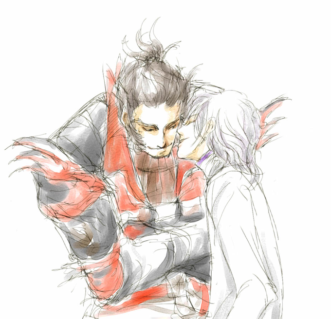 義丸と舳丸 もう傷は治っているのに「ほれほれ痛かったら遠慮せずに泣けよ」ってからかってくる兄きと「もう全く痛くないので人の顔で遊ばないでください」って返す弟分