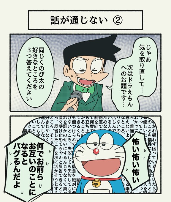 うちのドラのび、のびくんがドラちゃんのこと大好きなほど逆にあべこべ世界ののびくんはドラちゃんが嫌いになるっていう影の濃い構造になってる。