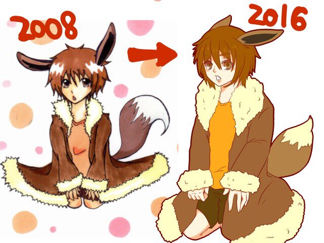 【ビフォーアフター】 左→約〜2008年頃のアナログ絵 右→今日描いた2016年の絵 イーブイ♂のココアです! うちで一番古株な子!!