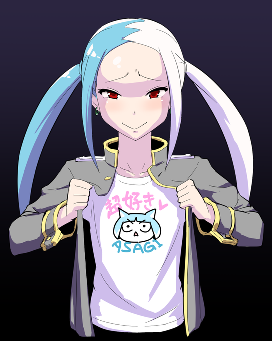 夜な夜な通行人に自作のクソダサTシャツを見せつけてアサギどのを布教する企んでそう子(仮)ちゃんの絵です。