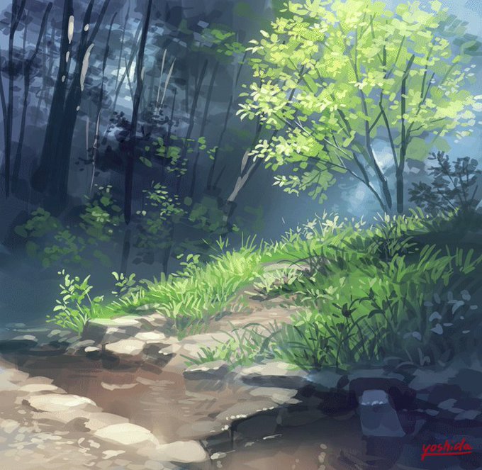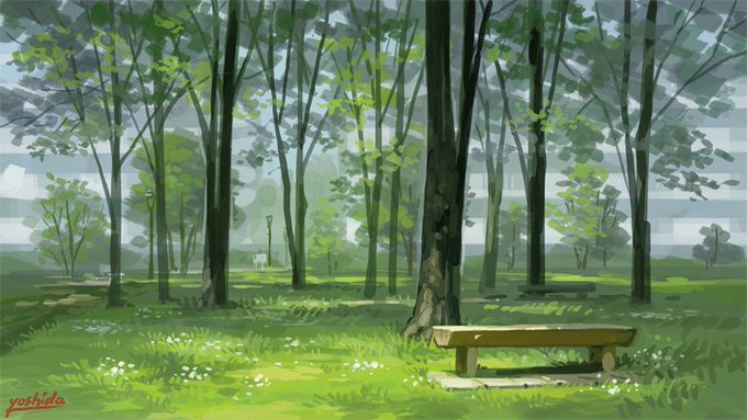 サークルカットのメイキングGIFです。最初にざっくり色を置いてバランスを見て、あとはひたすら描き込むだけ。近所の公園の風景を参考にしています。