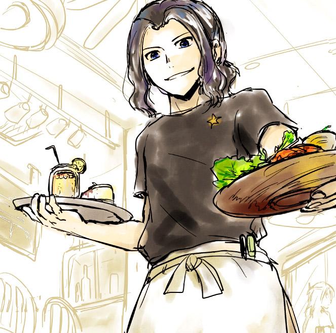 昼間言ってた有機栽培コーヒーとか自家製レモネードとか出てくるオーガニックカフェ的なところで働くTシャツにソムリエエプロンのウェイター手嶋(厨房兼任)を描きました