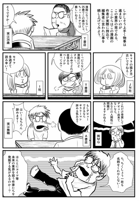 TLで出張編集部のレポ漫画をよく見かけるので、自分も以前ネタにした同人漫画を一部晒し上げ。編集者に言われたこと以外は一応フィクションです。「志望者へのきつめのアドバイスは止めて」とコミティア本部が編集部側に言っている噂は耳にした事あるけど、嘘だと思うよ。言う人はトコトン言うよ。