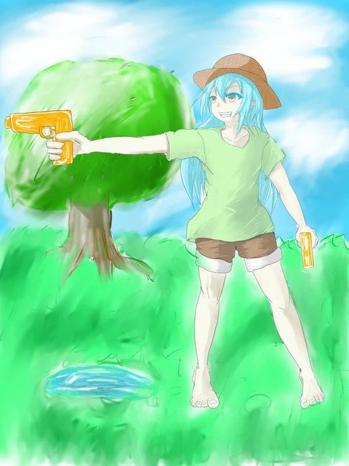 何を1番見せたいのか考えずに手なりで構図を決めたので修正の方向性が分からんですな。 見せたいものが •太陽→もっと真ん中に •水の表現→アイレベルを上げてもっと水面の面積を増やす •リ様とヴェ→アイレベルを下げて、キャラを画面中心〜上部へ って感じかな?