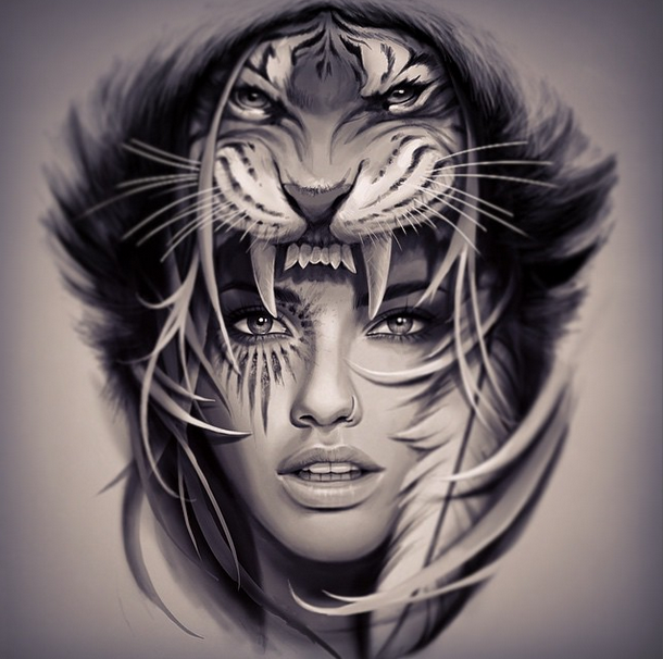 By davidgarciatattoo ♥ #art #draw #bw #tiger #girl #face #portrait #awesome #beautiful #pretty