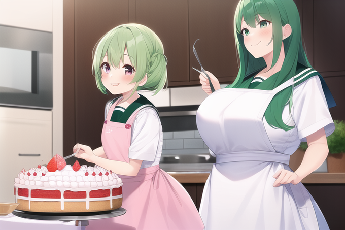 NovelAIさんのほうで「料理をする女の子=胸の大きい女の子」のイメージがあるのか、はっぱちゃんwith胸の大きいお友達、という絵もいっぱいできました……w #AIart #NovelAI #AIアート