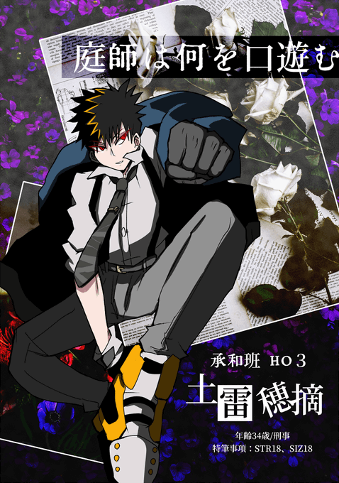 @TRPG_TL 「庭師は何を口遊む」KPまのたさんのもと本日から!HO3で新規探索者の土雷です。背中でクロスしてるタイプのサスペンダーつけてます。 強力なPL陣:なださん、ねくたさん、よらさん(五十音順) よろしくお願いします!ぼくもがんばります!高い所の物を取る時とか任せてください!