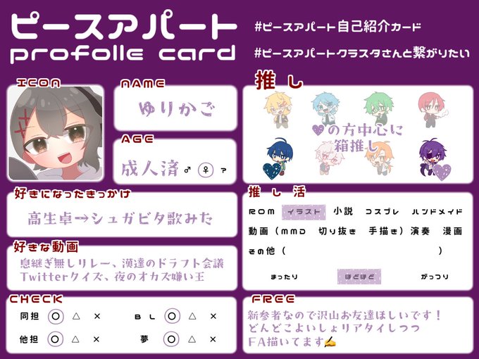 PUSおめでたいので便乗タグ…🥰 ♡かRTで気になった方お迎え行きます! #あたたかくなるクラスタさんと繋がりたい #あたたかくなる自己紹介カード #ピースアパートクラスタさんと繋がりたい #ピースアパート自己紹介カード