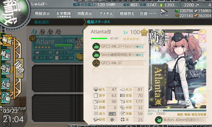 ケッコン艦122隻目くらいたぶんそう。 Atlanta 運18→23