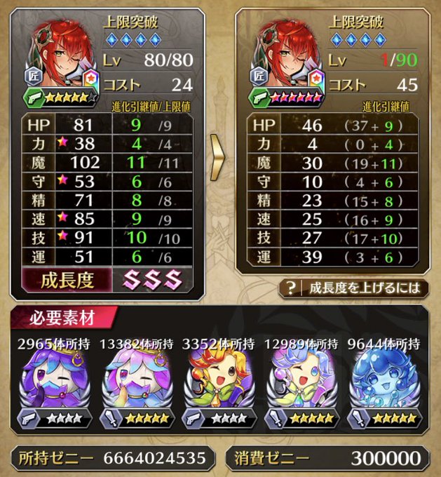 海上フラガさんを少し再育成…、覚醒させてからの転生って初めてだけど、固定成長分があるからレベル上げの途中だとどんなもんか分かりづらいね…。慣れてないだけなのかもしれないけど。