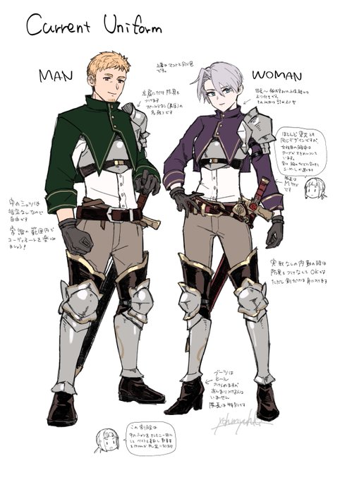今の騎士団制服 本に載せた絵に色置いたやつです 右のは最初に描いた設定画