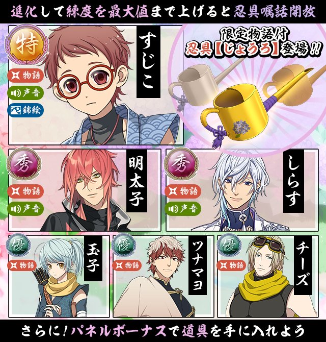 【ガチャ更新】「パネルガチャ・ぼくとあじさい」の配信を開始しました! 「すじこ、明太子、しらす、玉子、ツナマヨ、チーズ」の物語付き忍具が獲得できます! こちらは5月28日16時までの期間限定ガチャとなっております。