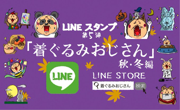 ゆるい手描きの着ぐるみおじさんスタンプ♪小心者でいつも着ぐるみを身につけているおじさん。優しいまなざしであなたを癒してくれます。第五弾は秋と冬で使えるスタンプ!