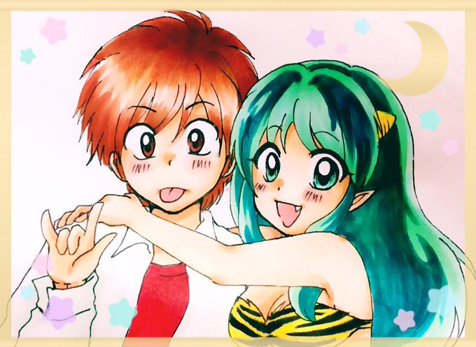 #高橋留美子5作品版深夜の真剣お絵描き60分一本勝負 お題【夫婦】 高校生夫婦💫 あたる君のシャツ塗り忘れました😭 @ranmawandoro