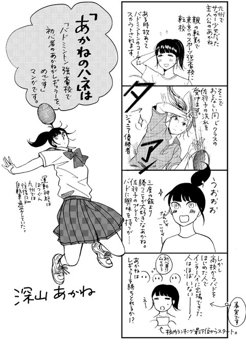 【お知らせ】明日「あかねのハネ」1巻が発売になります。女子バドミントン部のマンガです。ライバルものです。世にはたくさんスポーツマンガがあるので「あかねのハネ」はこんなマンガです、というものを描いてみました。どうぞよろしくお願いします!
