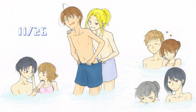 #うちの子とお風呂入りませんか いい風呂の日ってことでリクエストいただきました水着で混浴~! ゴルトはナニかをチェックし始めるし、エリーゼは胸を気にしてブクブクするしとてもめんどくさい集団。