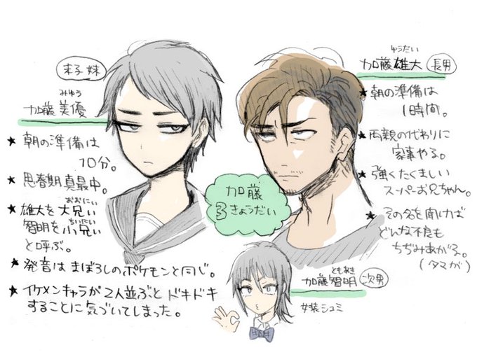 加藤美優(かとうみゆう)、中2。加藤家、雄大とトモの妹。アホ兄2人のせいで頭下げまくる母ちゃん見て育ったせいか素行は特に問題無いし冷めてる。全人類森羅万象に対してトゲトゲしている思春期。BLが好きなのは内緒