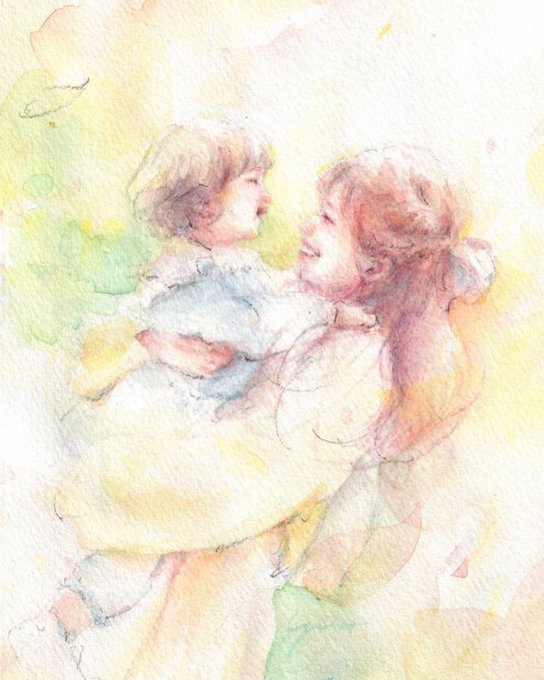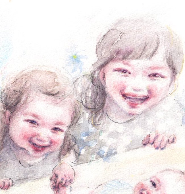 「見て!長男くんが笑ったー!ほんっとに可愛いねぇ」そんな声がそのまま聞こえてくる作品に。今回は写真ではなく動画をもとに描きました。顔をよせるとケラケラ笑う長男くん、その様子を見てはしゃぐお姉ちゃん達。