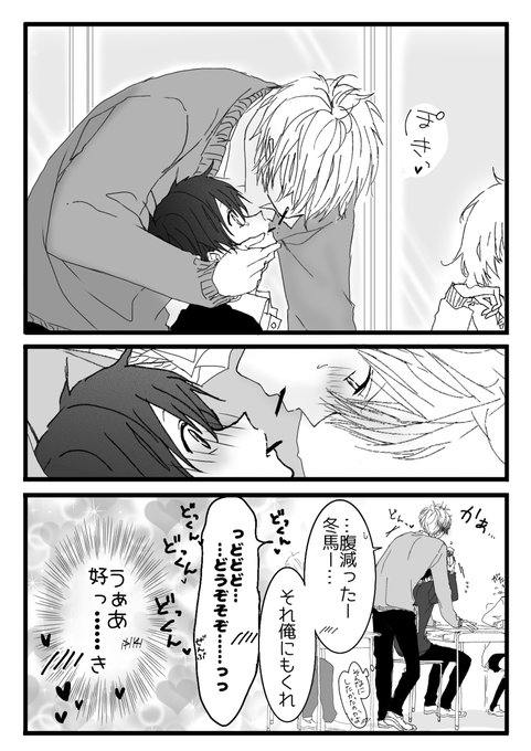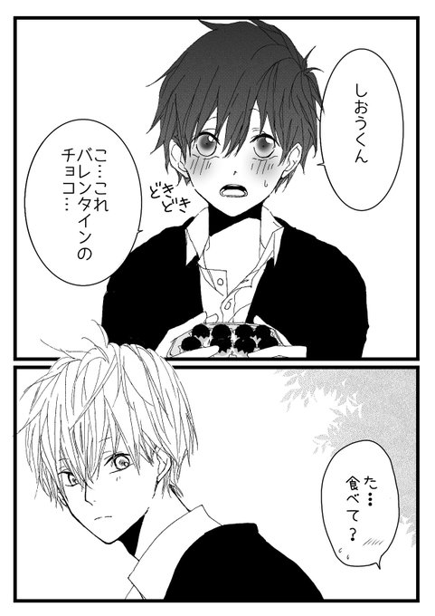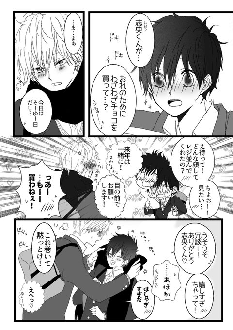 前回(去年)のツンデレバレンタインデーはこちら😊(もう知ってるよって方は何度もごめんね🙇♀️) ツンデレ攻め志央くん×健気受け冬馬 付き合ってることはオープンなふたり☺️ #創作BL #バレンタイン あっこれも上着着てないね😂寒そう⛄