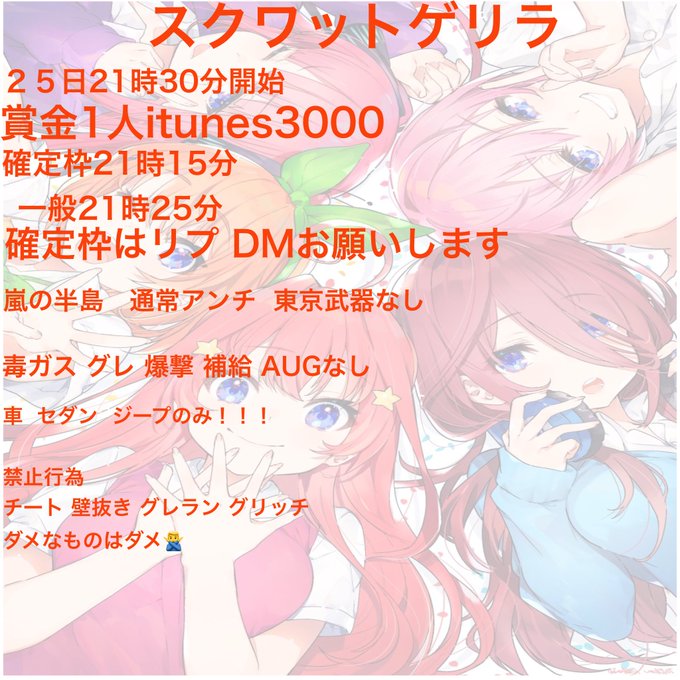 本日 22時 スクワット 賞金ルーム開催します 1500×4 賞金 アマギフ 参加条件 全員 フォロー RT @gati_mofuu @pito_0128 @Air313131 @yuma_0122_ 多いけど許して(>︿<。) 交換枠優先します!! 他応募リプよろちくび #荒野行動 #スクワットゲリラ #賞金ルーム #スクゲリ #ゲリラ
