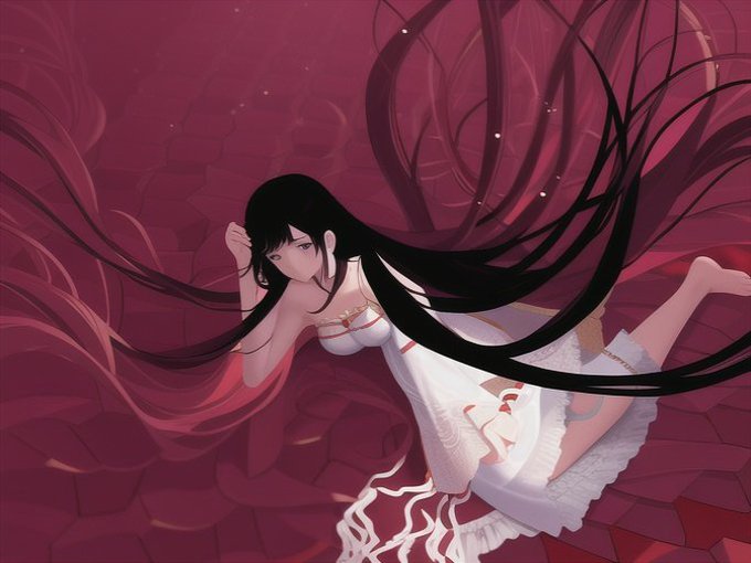不透明の液体に沈んでいくアイコンの女。2枚目は顔。