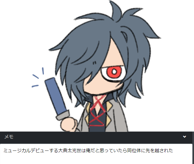 ゆめ「PC誰がいいとかある?」 とく「うーん…作ったときの仮置きは長光」 ゆめ「やってやろうじゃん…」 とく「なんで喧嘩腰なの?」 そしてこれは適当に色置いたら毒島メイソン理鶯になった小豆長光