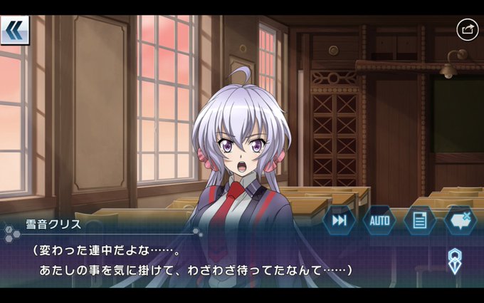 渋々行くことに。そんな転入初日、クラスメイトに一緒にお昼に誘われますが断るクリスちゃん。その時ノイズが現れます。ノイズを倒し学校に戻るとクラスメイトが待っていて授業のノートを取っていてくれました。