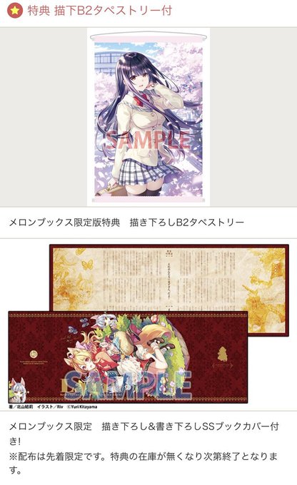 なお、メロンブックス様お馴染みの店舗特典は通常配布がラティーファのブックカバーで、有償限定特典が美春のB2タペストリーでございます。特典は数に限りがございますので、ご予約はお早めに!https://t.co/fuzWG3Qres
