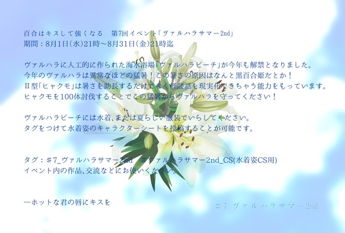 公式イベント「ヴァルハラサマー」と「ゆりきす1周年」を開催いたします。 参加は自由となっております。みなさまのご参加お待ちしております。 当企画についての概要はこちらhttps://t.co/pbWtXQTPhf … #ゆりきす公式 #4_ヴァルハラサマー #ゆりきす1周年