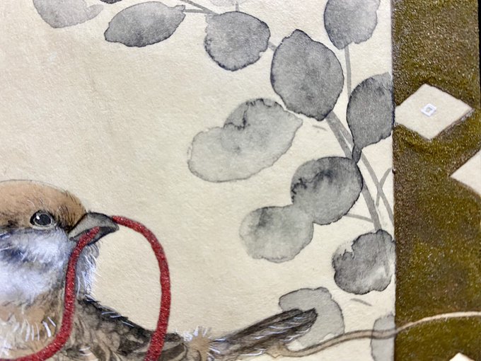 糸を引っ張っていたずらしているところ。過去の自分との別れを尻尾の解けている糸で表現しました。(新学期、新年度なので)