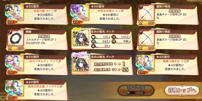 最近は全部天井だったから今回も覚悟してたけど 無償60連目で2キャラとも出たので終了です。 金3つてですべてピックアップキャラなのは珍しい #あやらぶ