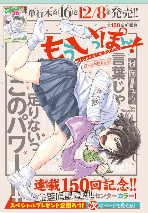 木曜日。週刊少年チャンピオンに『もういっぽん!』150話、センターカラーで掲載です。プレゼント企画(紙雑誌のみですが)もあります。ぜひ!