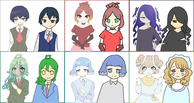 本番用のイラストができたので仮置きで描いた絵と並べてみる。 真ん中2人は変化少なめ、左2人は丁寧に描いたねぇという印象、右下おまえ誰…